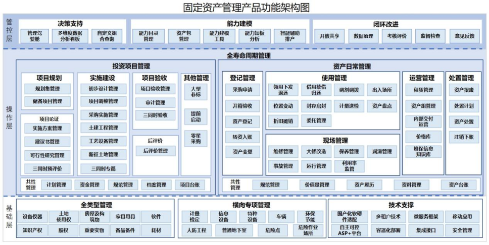 投资经营全过程:从固定资产投资项目规划、投资决策、项目实施、验收,到固定资产运营、处置、项目评价全寿命周期管理。