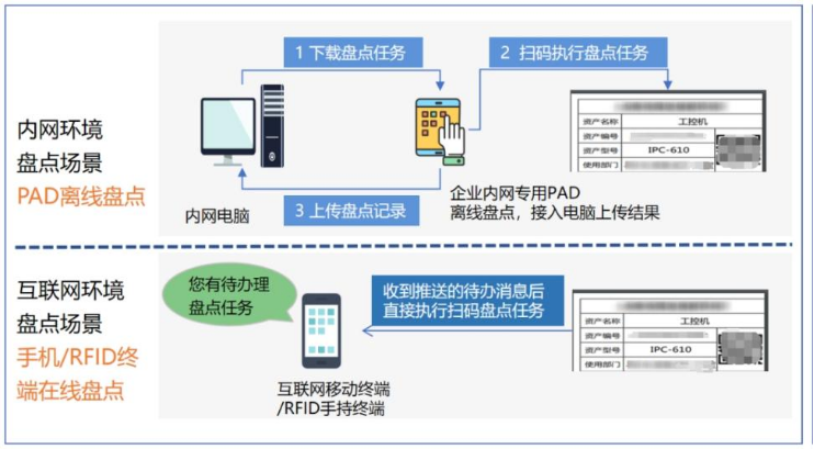 移动智能应用:通过RFID等智能标签和智能手持终端设备,实现在资产现场的快速数据采集,实现智能范围管控和资产快速盘点。