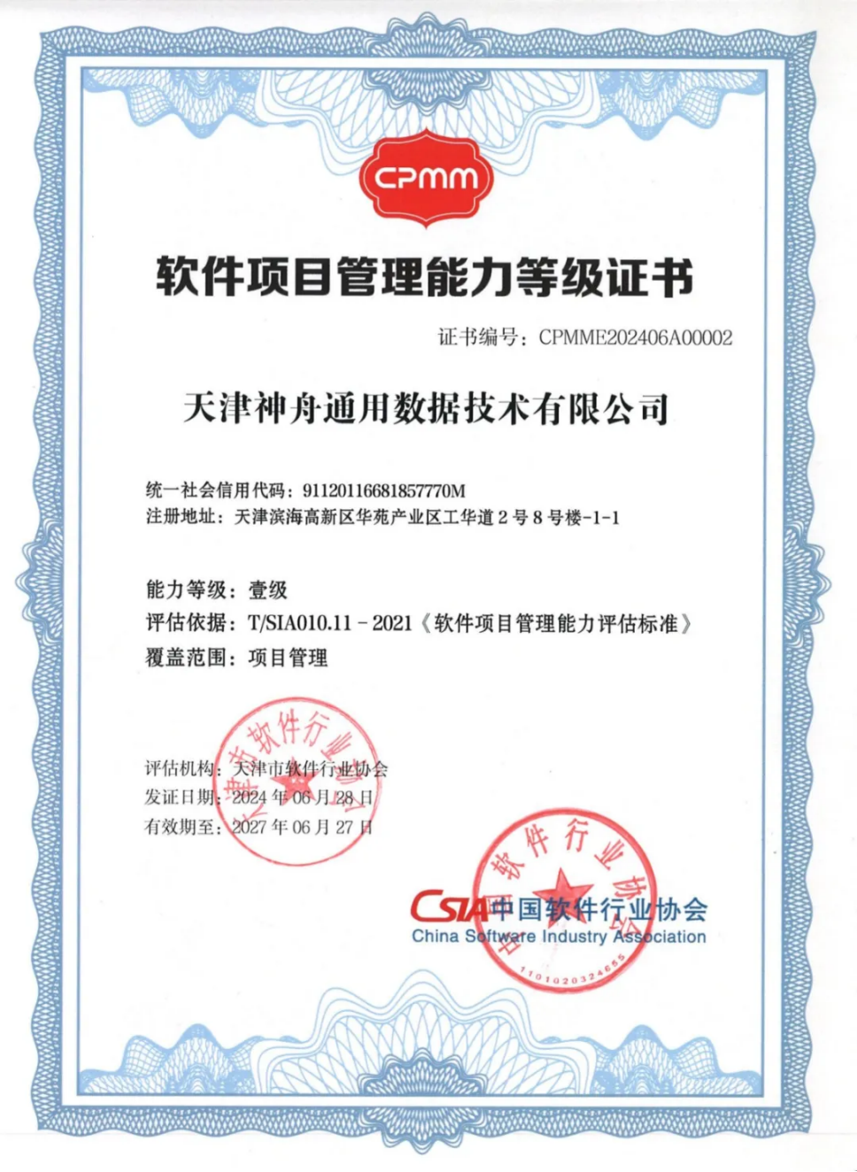 经过天津市软件行业协会的受理和初评,并由中国软件行业协会组织的专家团队进行严格评审,神软公司子公司天津神舟通用数据技术有限公司凭借优秀的项目管理能力,荣获了软件项目管理能力评估(CPMM)一级证书。