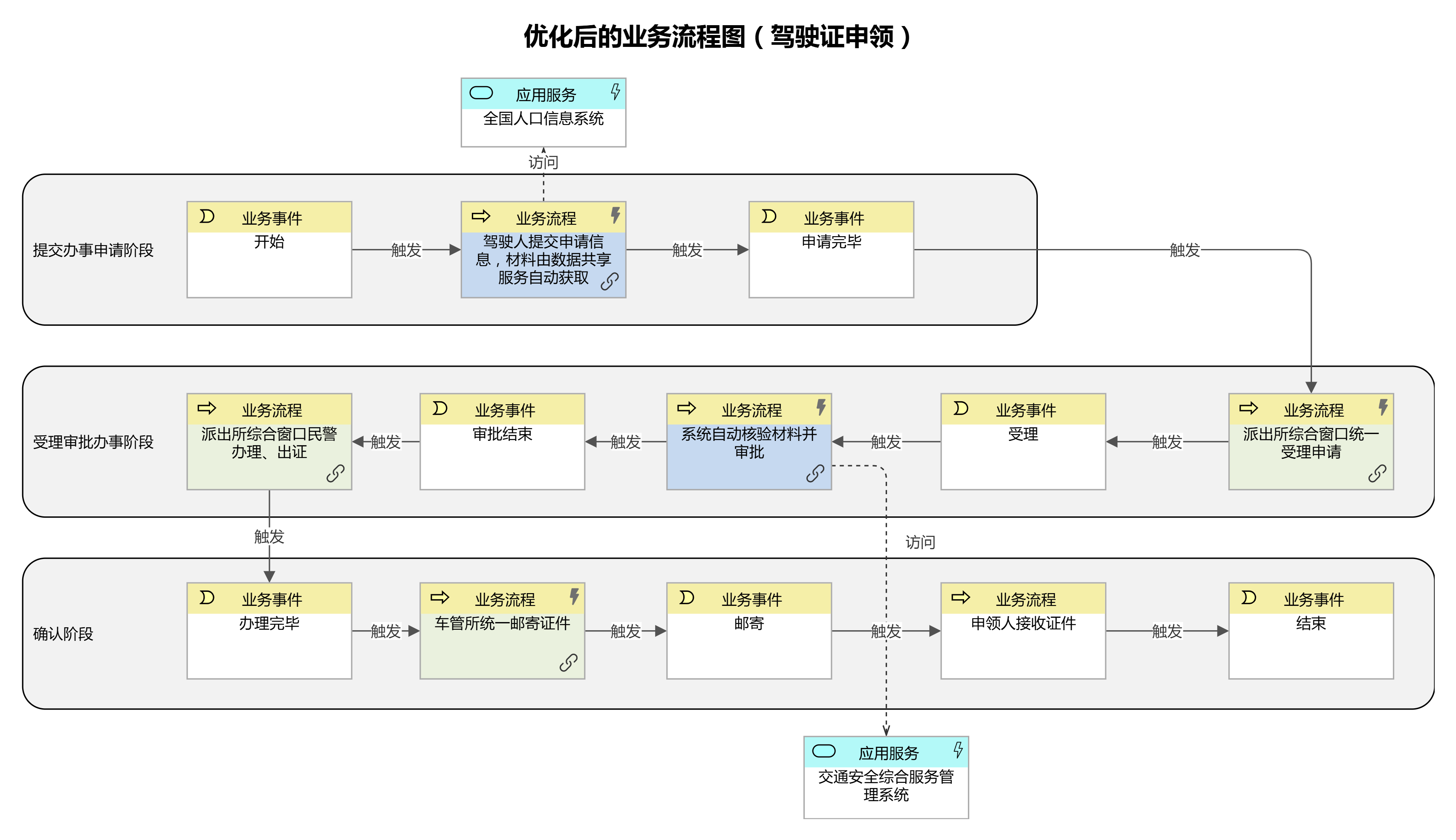 优化业务流程:谋划好可集成的数据、可协同的部门后即完成了多跨场景的集成过程。集成后形成的新流程活动替换现行活动,实现流程的再造。再造流程将解决重大需求中描述的“堵点”、“卡点”问题,因此新流程中的创新活动、智能活动就是需要改革的项目。