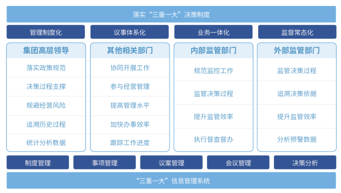 ??神软针对企业落实“三重一大”所面临的挑战,助力企业构建集团及各级法人单位全级次的“三重一大”决策运行管理系统,通过全景监控、全程跟踪,全面信息反馈和全部痕迹保留支撑企业切实将“三重一大”落实到实处。针对不同类型用户提供个性化、定制化的功能和服务,满足外部监管要求与内部管理要求,从而使公司治理规范化、管理制度化、监督常态化,建立健全“三重一大”科学决策、高效执行、有效监督的工作体制和机制,防范决策风险。